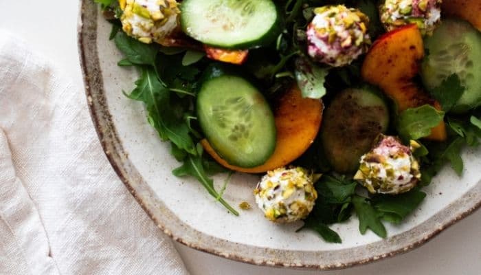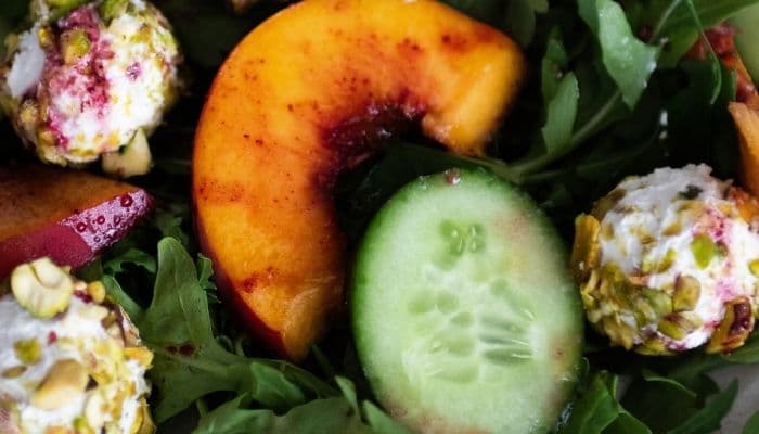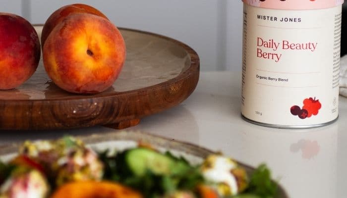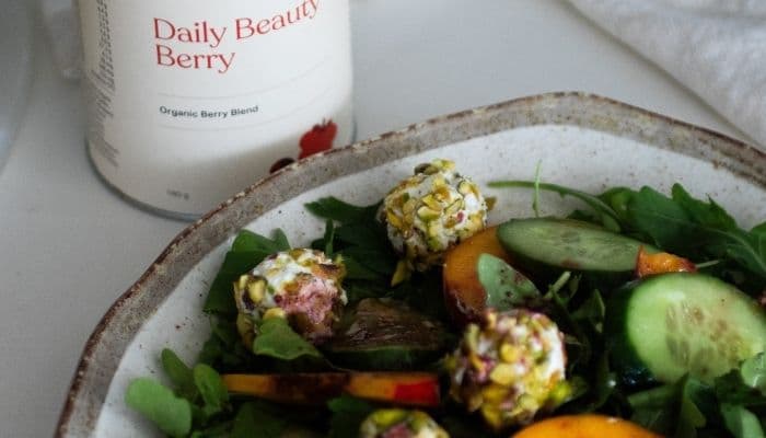 This vibrant summer salad is bursting with texture, flavour, and skin-loving nutrients. Juicy peaches, crisp cucumber, and creamy pistachio-crusted feta are served over peppery rocket, all finished with a tangy Berry Collagen dressing for a subtle antioxidant boost. Gluten-free and effortlessly elegant - it’s as nourishing as it is beautiful.