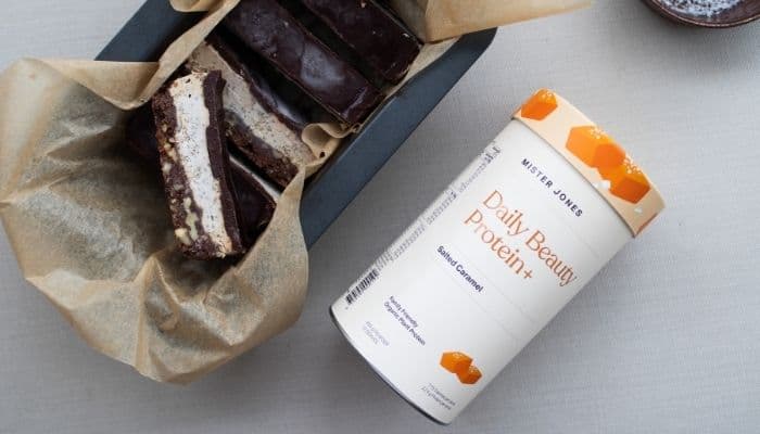 These Salted Caramel Cookie Dough Protein Bars are the perfect snack to prepare weekly, to help you reach your protein goals with ease. Made with Mister Jones Daily Beauty Protein - Salted Caramel not only makes them taste utterly delicious, but helps to support your beauty from the inside out too. Whether you need an on-the-go snack or an afternoon pick-me-up, these bars are a simple, satisfying option you’ll want to keep on hand.
