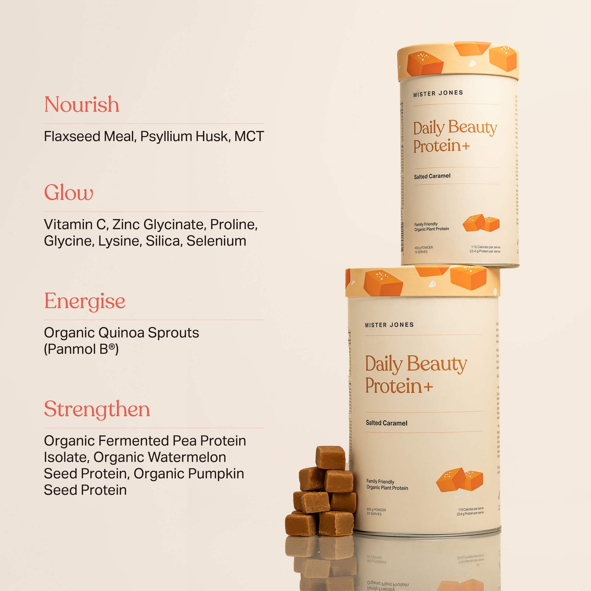 Daily Beauty Salted Caramel Protein+™ is a velvety, dessert-like protein blend crafted by naturopaths to go beyond typical protein powders. With rich buttery caramel notes balanced by Himalayan sea salt, this creamy plant-based protein sustains your body while supporting skin, gut, energy, and muscle health.