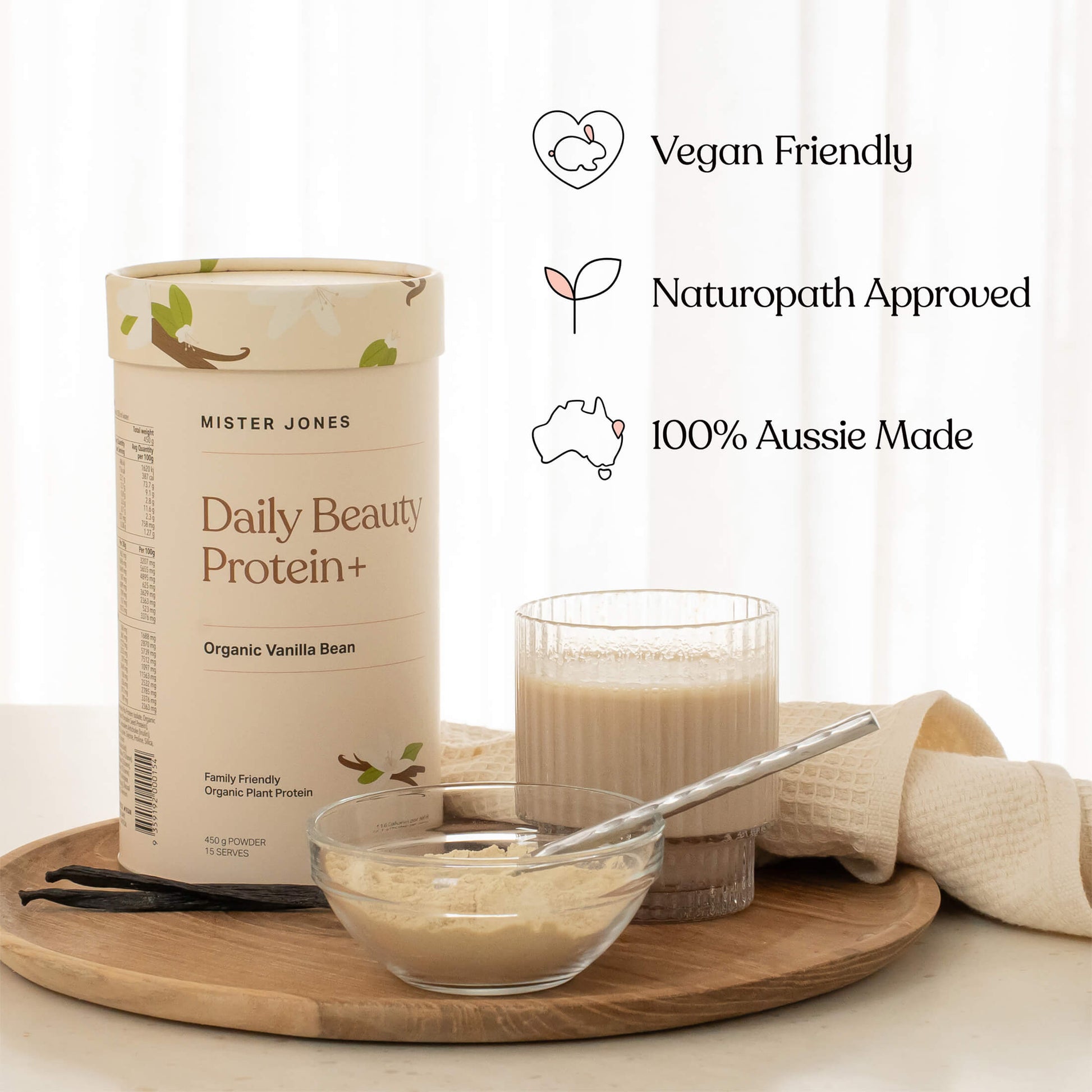 Daily Beauty Organic Vanilla Protein+™ combines silky smooth plant-based protein with organic vanilla bean and a hint of cinnamon for a creamy, nourishing sip. Crafted by naturopaths, this all-in-one protein blend supports daily nutrition, muscle health, skin and hair, digestion, and sustained energy throughout the day.